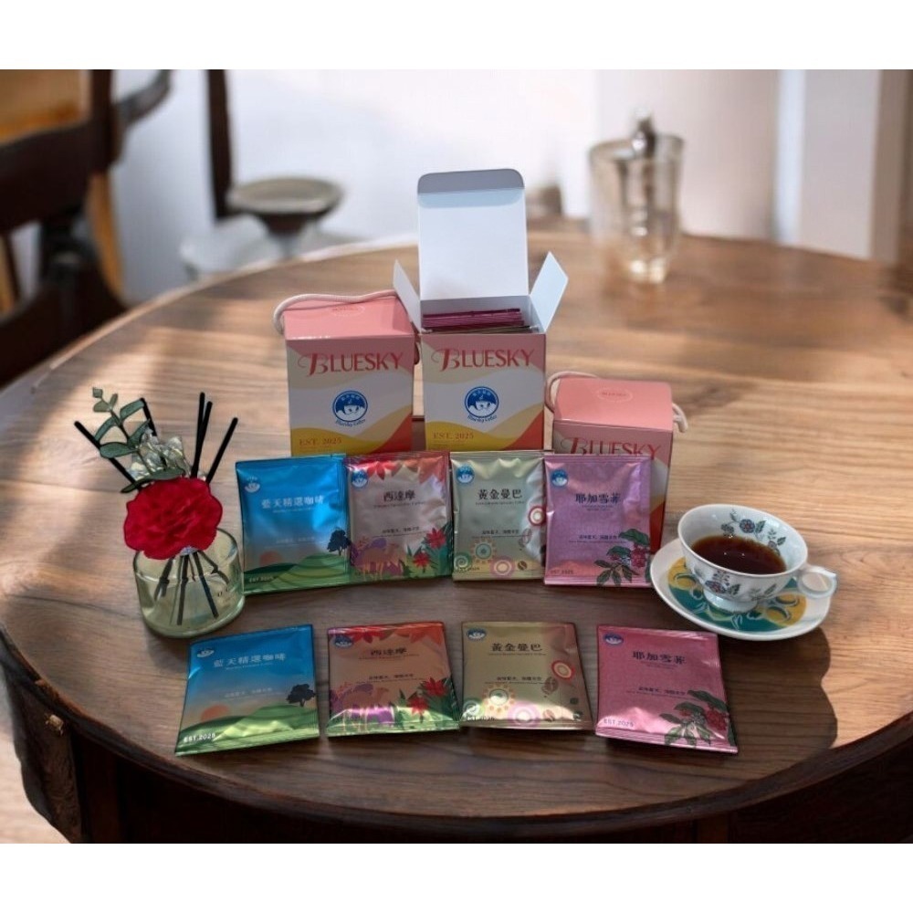 內含精選耳掛2包、西達摩耳掛2包、黃金曼巴耳掛3包、耶加雪菲耳掛3包從藍天精選的平衡風味,西達摩花香,黃金曼巴的濃郁厚實,到耶加雪菲的果香馥郁,帶你走進每一個晨曦,感受無垠藍天的清新與咖啡的香醇。無論是晨起的提神之飲,還是午後的放鬆時光,這份香醇與溫暖,陪你走過每一個晨昏,寫下屬於自己的藍天故事。產品保存期限依外包裝標示日期為主外盒尺寸:11x11x14cm(紙盒/附提繩)